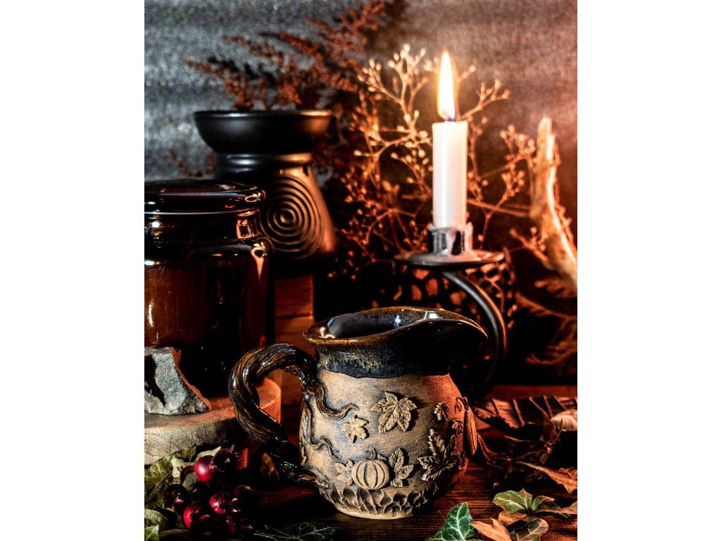 Kameninový hrneček s kapkou magie jsem vytočila na hrnčířském kruhu, vyzdobila kouzelnými přírodními motivy, vypálila, naglazovala a podruhé vypálila na vysokou teplotu.