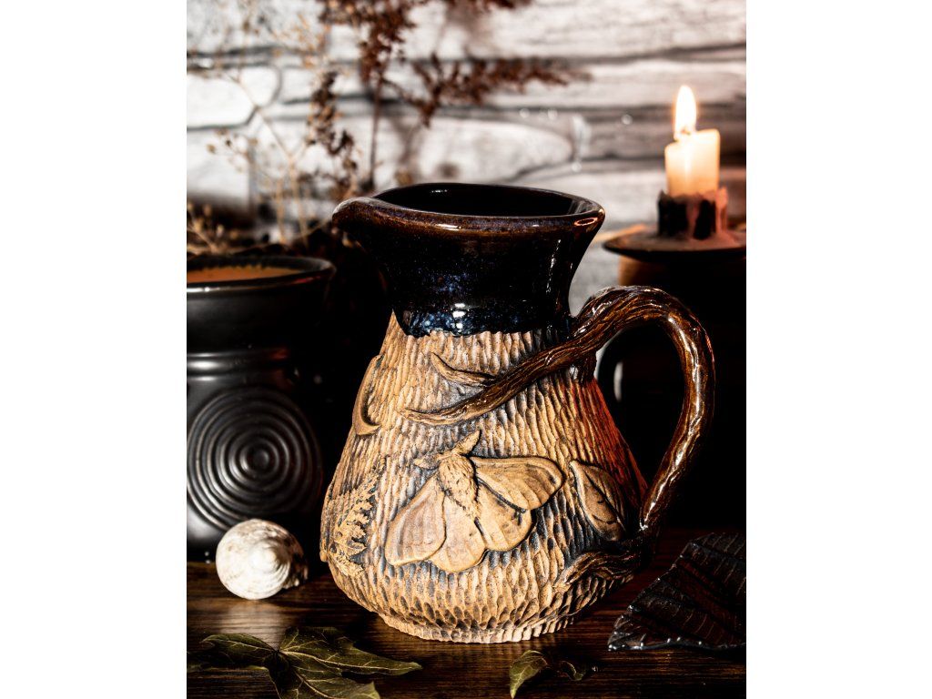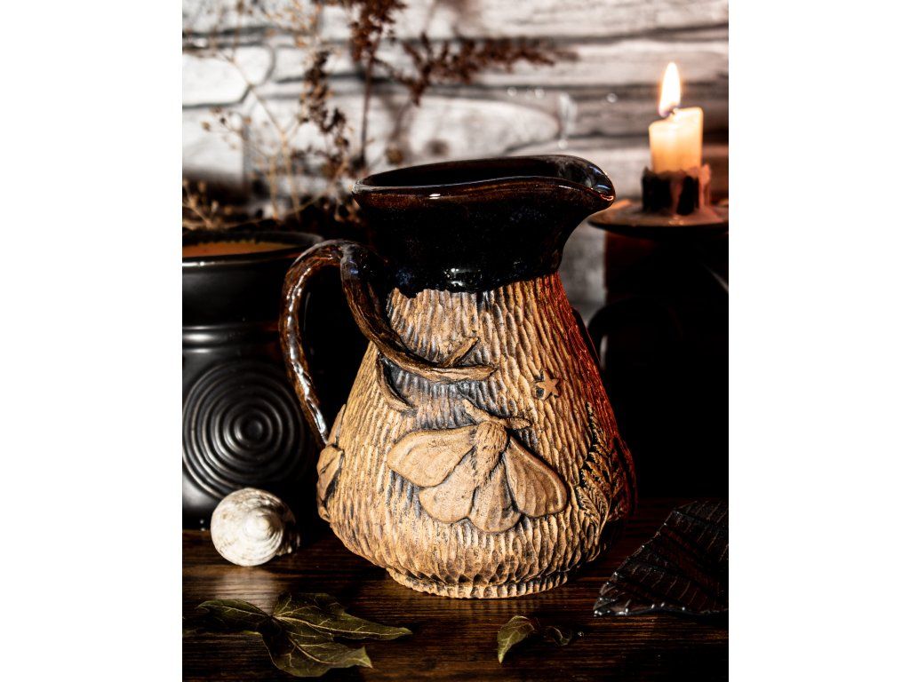 Kameninový džbánek s kapkou magie jsem vytočila na hrnčířském kruhu, vyzdobila kouzelnými přírodními motivy, vypálila, naglazovala a podruhé vypálila na vysokou teplotu.