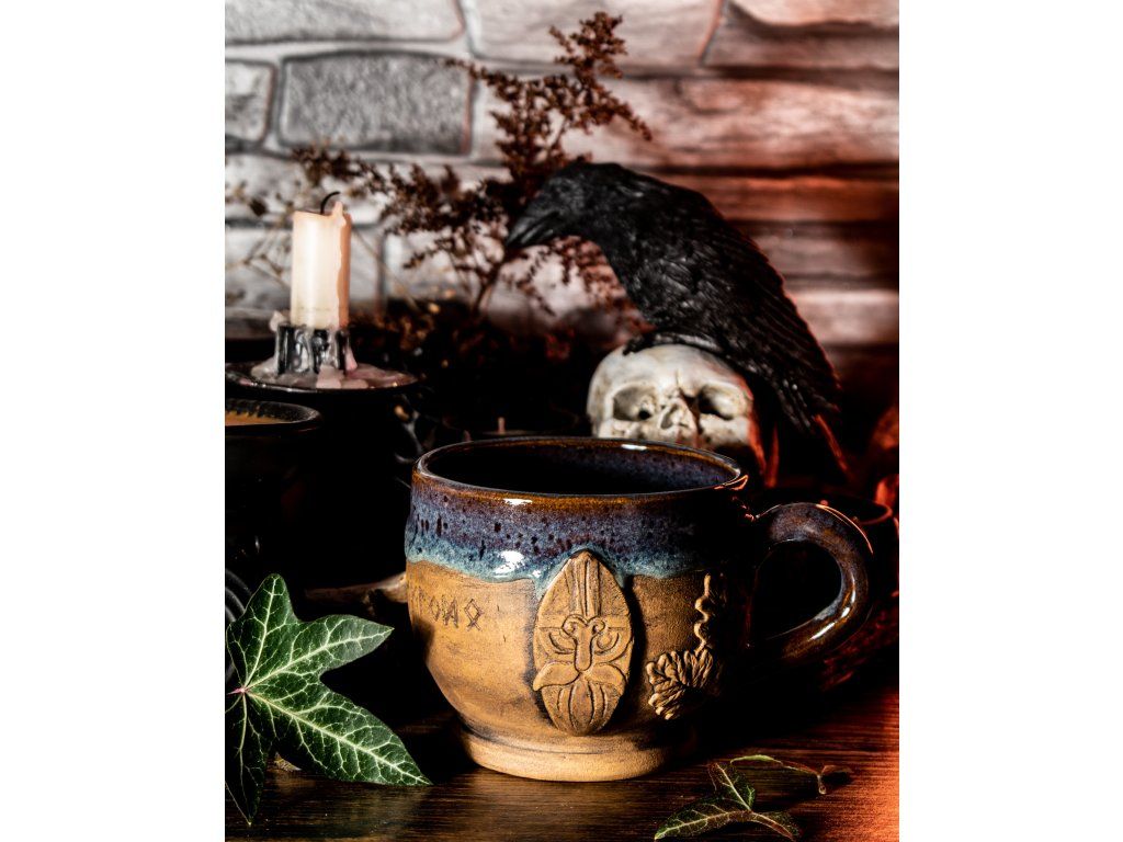 Kameninový hrneček s kapkou magie jsem vytočila na hrnčířském kruhu, vyzdobila kouzelnými přírodními motivy, vypálila, naglazovala a podruhé vypálila na vysokou teplotu.