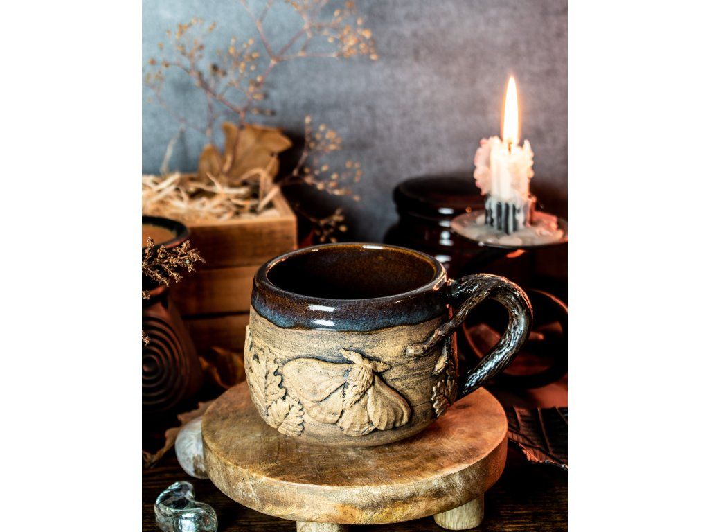 Kameninový hrneček s kapkou magie jsem vytočila na hrnčířském kruhu, vyzdobila kouzelnými přírodními motivy, vypálila, naglazovala a podruhé vypálila na vysokou teplotu.