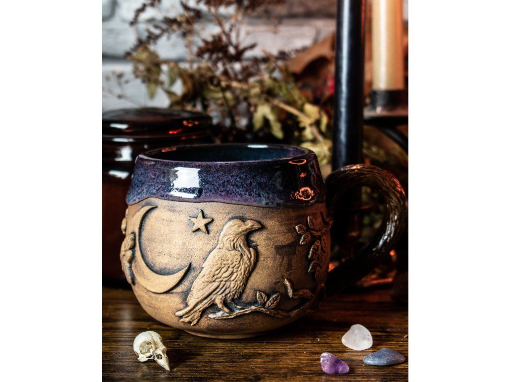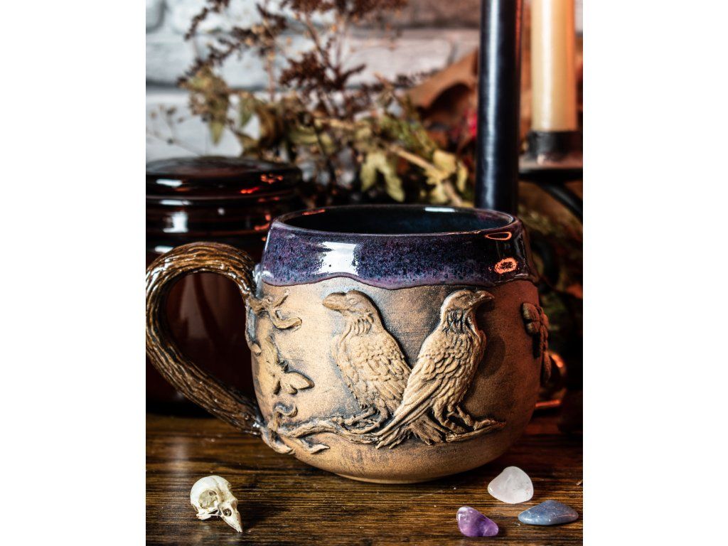 Hrnek, který není stvořen pro povrchní otázky. Hrubý reliéf havrana, pevně vtištěný do hlíny, je archetypem tvého nejvěrnějšího průvodce. Je to nádoba pro tvou nejtěžší praxi a stínovou práci. Pro chvíle, kdy potřebuješ usednout v šeru, naslouchat zprávám z podvědomí a neutíkat před pravdou, i když je nepohodlná. Havran neprosí o povolení ke vstupu. Létá tam, kam se ostatní bojí pohlédnout, hluboko do stínů.
