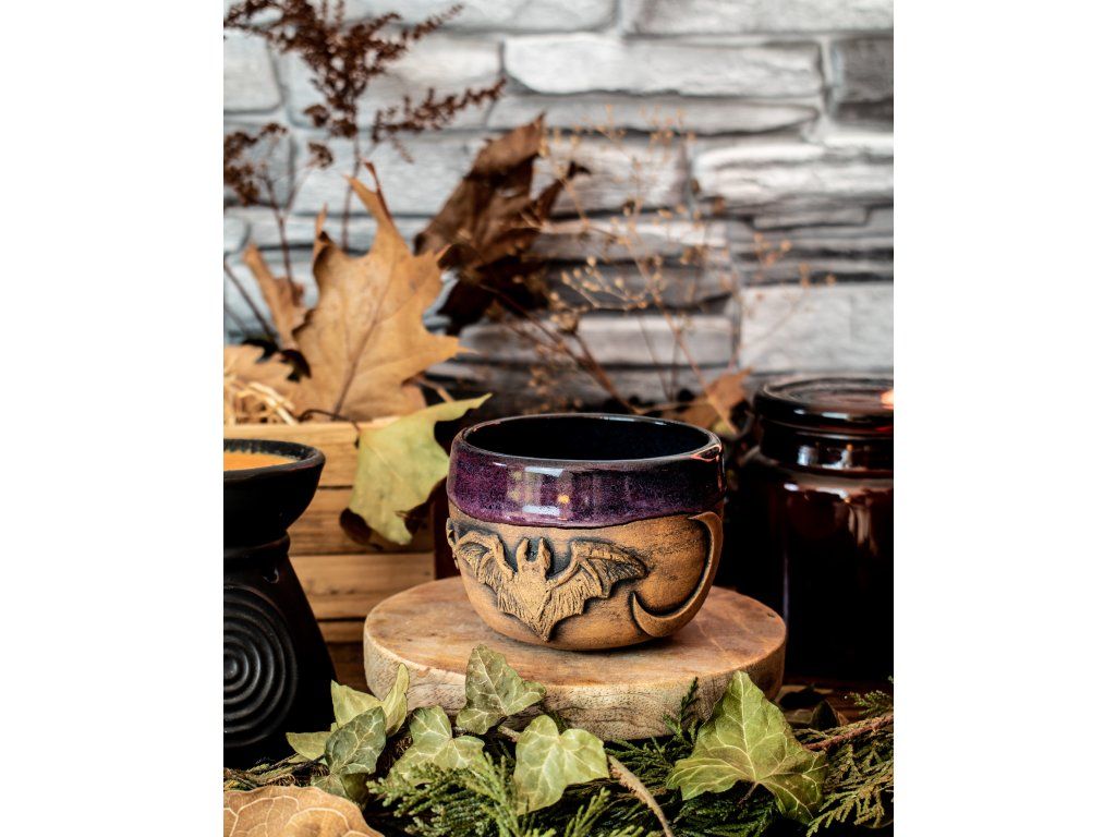 Kameninový kalíšek s kapkou magie jsem vytočila na hrnčířském kruhu, vyzdobila kouzelnými přírodními motivy, vypálila, naglazovala a podruhé vypálila na vysokou teplotu.
