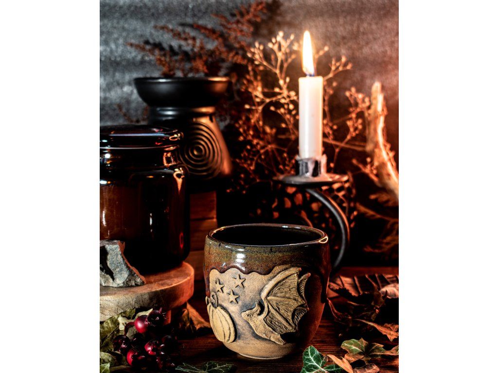 Kameninový kalíšek s kapkou magie jsem vymodelovala v ruce, vyzdobila kouzelnými přírodními motivy, vypálila, naglazovala a podruhé vypálila na vysokou teplotu.